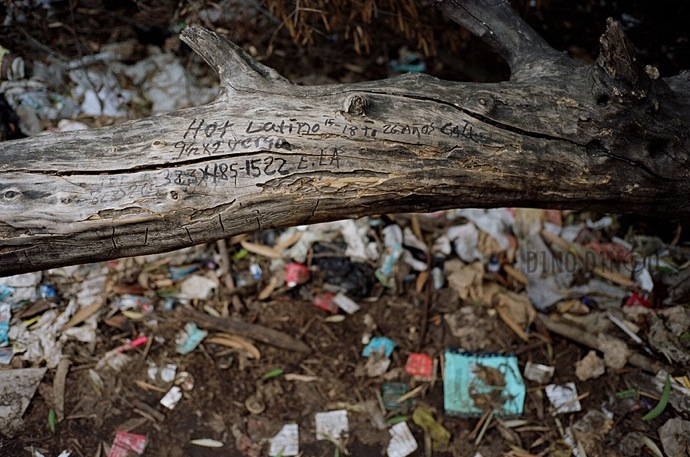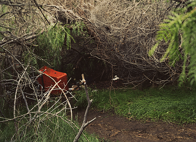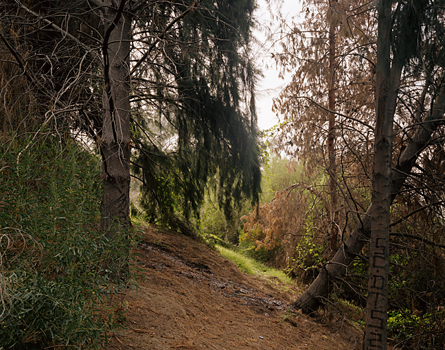 The press release describes another photo series: “The large-format images from “Elysian Park” reveal quiet landscape portraits shot on the cruising trails that intertwine alongside Dodger Stadium and the Los Angeles Police Department Training Academy.” Messages are carved into trees. An abundance of garbage clutters the underbrush--prophylactics and their wrappers abound.