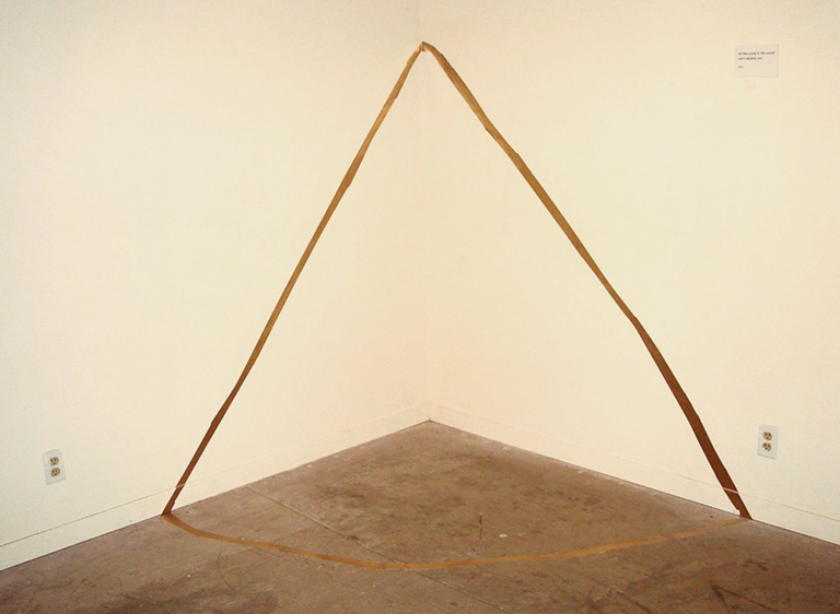 In discussing influences Dinco mentions Felix Gonzalez-Torres, Stephen Prina and Vaginal Davis. Dinco uses at times a minimalist, conceptual aesthetic and at others an arms-length vérité to point directly to subject matter as well as sources. "All the candy in the world can't replace you," 2009 does not mention Gonzalez-Torres by name but any follower of the contemporary art world of the last decades would identify--in a roughly taped off gold painted outline that traverses two walls and the floor, forming a rough triangle in the corner of the room--a reference to Gonzalez-Torres’ piles of candy work, often corner pieces, such as “Untitled (Public Opinion),” 1991. This work and Gonzalez-Torres’ smaller candy pieces (where the weight of hard candy equals the weight of a man) are often upheld as iconic mementos of loss as chronicled by the first generation devastated by AIDS. Gonzalez-Torres’ candy piles were to be diminished by the viewer and in turn replenished by the gallerist, curator or collector. Significantly Dino’s piece has no candy in it; there is nothing except for an outline--like the chalk left after the murder victim has been taken away. Through the piece and it’s title Dinco laments the loss of the talent, of the man, more than the loss of the art objects Gonzalez-Torres created.