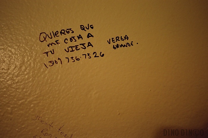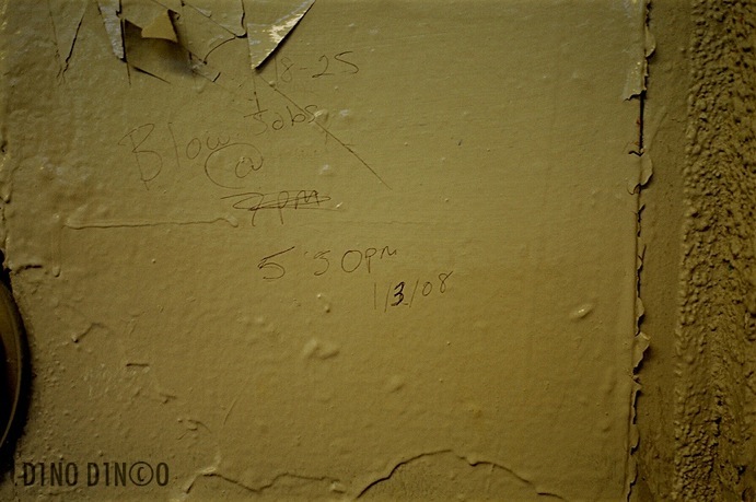 In one of Dinco’s "sexgraffiti" photographs the viewer can see a ball point pen message written over mustard yellow, enamel paint (of course--thick and flaking and chipped and dirty): “18-25 Blow Jobs @ 7 pm 1/1/08.” But this isn’t actually what the message reads because “7 pm” has been crossed out and “5:30 pm” has been added and the “1” representing the day in the date has been written over and replaced with a “3.” So, the message reads, at the time of the photo, “18 - 25 Blow Jobs @ 5:30 pm 1/3/08.” The simple immediately leads to a rabbit hole which in turn leads to routes too multifarious to easily map. In addition, as with much of Dinco’s work, the element of time is introduced. How can we talk about a static work which so obviously has captured the ephemeral--a work which suggests it just as easily could have been something different?