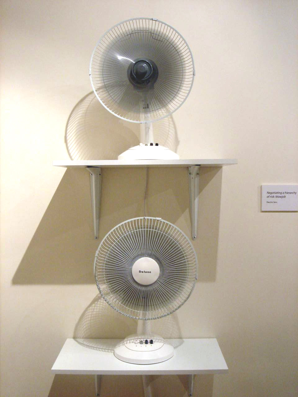 Dinco’s work speaks softly in confronting the signage leading to anonymous sexual encounters, or other systems of signs and types of language that exist between friends, acquaintances and lovers. As light as his touch is, Dinco’ work is at times laugh-out-loud funny; he is a humanist versed in tragicomedy. "Negotiating a Hierarchy of Risk: Blowjob," 2009 is a “pair of whirring electric fans,” one on a shelf above another. Upon observing that one of the fans spins without a protective cover, the viewer understands the title. Dinco’s work often has a “hook” and fortunately this bit that pulls us in, or, even, place where we might hang our hats and feel at home, is an entry point to other discussions. The two fans can function as minimalist installations of found objects or pop representations in the manner of Jeff Koons, but then the work nudges the viewer to think about the personal decision making process as it intersects with mortality and the sociological and the political and this leads to other considerations and these then multiply the layers of reference.