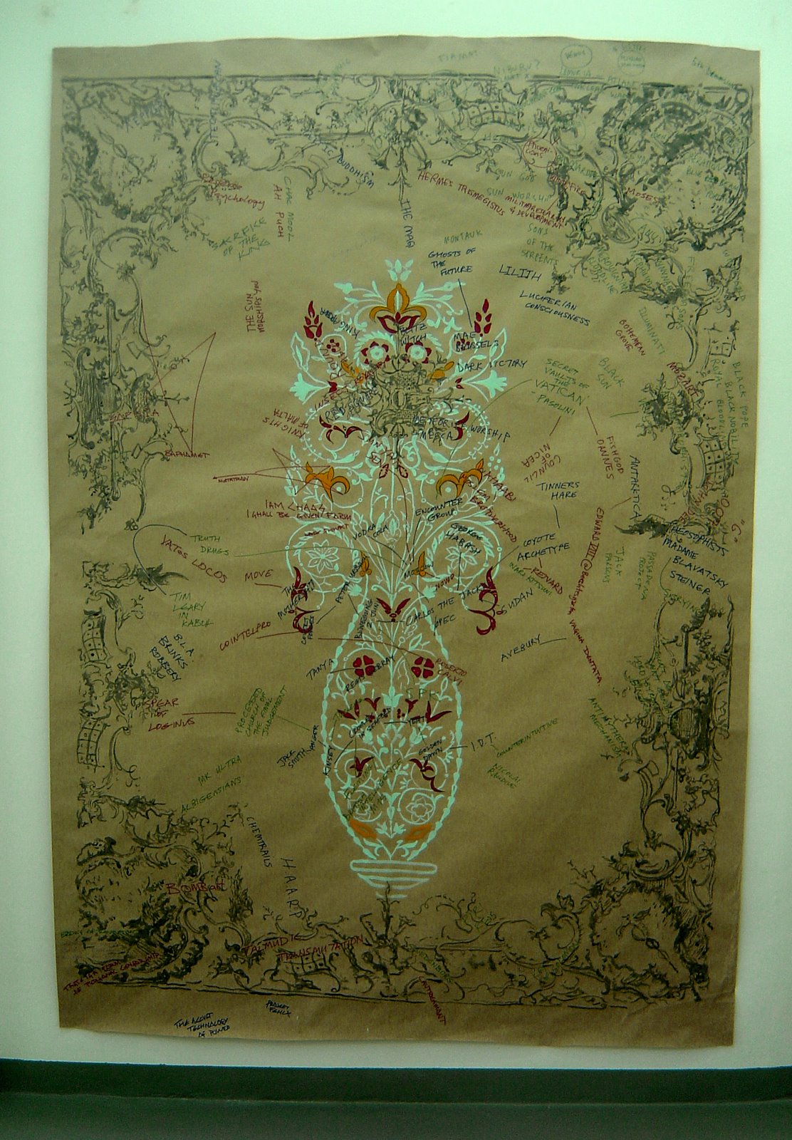 Goldsworthy’s collaboration with BOMBart “BOMBart 1” is another large work on brown paper. Creating an internal frame and creating a central image are rococo patternings. Texts are hand written in multiple colors. Some are connected by lines. Others are scattered here and there. In one area near the top right written in blue caps is “GHOSTS OF THE FUTURE,” “LILITH,” and “LUCIFERIAN CONSCIOUSNESS.” Nearby in red caps is written “MOZART” and “BOHEMEAN GROVE” (where it looks like the “i” in “bohemian” has been turned to an “e” to make a pun or perhaps an “e” was turned to an “i” as a correction). In another section appears the phrase “I am chaos I shall be given form." Among the numerous texts connected by lines is “Moscow” (which holds a central position with many connections fanning out from it) leading to “Encounter Group” leading to “Secret Vaults of the Vatican Pasolini” with this string of connections ending with “Council of Nicea.” The references run the gamut from myth (“Hermes Trismegistus”) to modern mysticism (Theosophists Madame Blavatsky Steiner”) to modern crime (“Carlos the Jackal”). The galaxy of references in this work at once echo the concerns Goldsworthy makes clear in each of his paintings and, further, helps define the parameters of his project by putting it amid a wider terrain of sympathetic considerations.