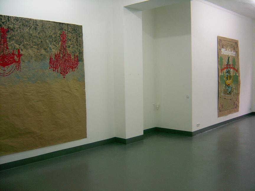 Rupert Goldsworthy’s recent paintings on brown paper loom over the viewer from fourteen feet above. His renderings feature juxtapositions of imagery--some taken from signage around where he lives and works in Berlin; others borrowed from the international histories of radical and decorative image making; and others invented with the history of fine art image making in mind. Other works are collaborations which allow Goldsworthy’s work to expand his investigations--towards digital photography, towards even more fervent text making.