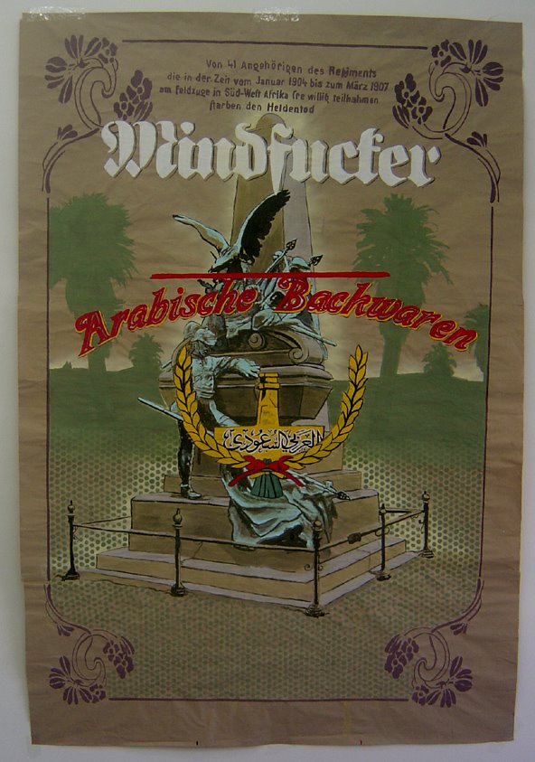 I am interested in the awkward juxtapositions of contemporary Berlin. How on military remembrance days, wreaths are still laid on the tombs for German regiments who died in Africa. The reference at the top of the “Mindfucker” painting is to the “Heldentod” (hero's death) of 41 German soldiers from one regiment in “German” S. W. Africa. They still remain “heroes.” No acknowledgment is made concerning slavery and colonial land rape.
