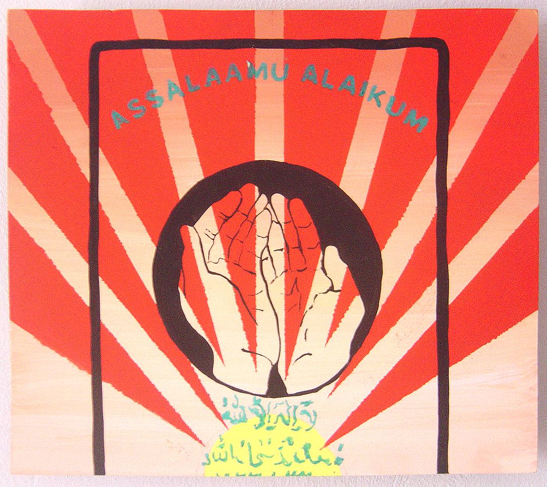 Goldsworthy’s large works on paper include “Mindfucker,” “Circus Berlin,” and “Leather Angel.” In “Leather Angel” the juxtapositions are quite clear if not easily understood. Set into an Islamic design crowning the painting is the text “Mai 1968.” A burly, hairy chested man is depicted mostly nude from the waist up except for a pair of gauntlet style gloves, some leather straps, a small leather hat, and a pair of angel wings. Blue lines radiate from behind him. He is flanked by Chinese characters and arabic text runs along the bottom of the work.
